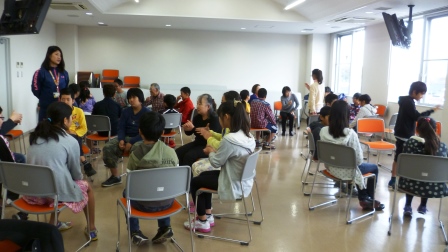 4つのテーマ「視覚障害者」「聴覚障害者」「高齢者」「幼児」の4グループに分かれ、立場の弱い人達と、どう関わっていくか、自分たちにできることは何か、共生の方法を探らせる取組の一つとして交流会を持ちました。