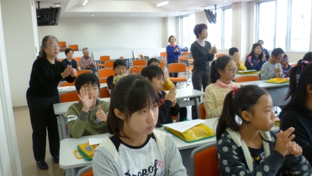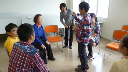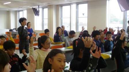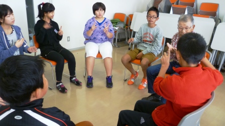 聾唖の方と練習してきた手話での交流の様子です。4グループに分かれ手話ボランティアの方に手伝ってもらいながら、聾唖の方と直接の交流です。どの子も自己紹介したり考えてきた質問をしたりしましたが、自分の手話で聾唖の方に気持ちを伝えようと必死で頑張っていました。一生懸命な姿に感動を覚えました。