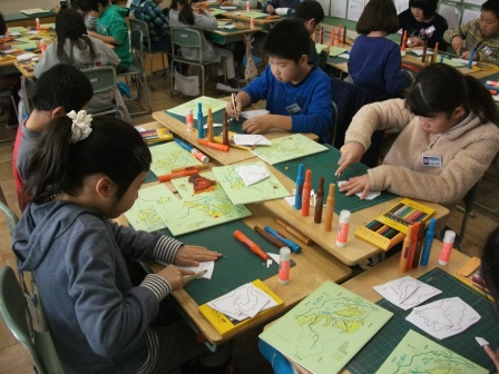 4年生社会科の「埼玉県の土地の様子」の学習として、埼玉県立文書館の先生から、埼玉県の地形についてのお話や埼玉県の立体地図の作り方を教えていただきました。立体地図では、平地、丘陵、台地、山地、主な河川などを表すことができました。この学習は11日にあと1クラス行います