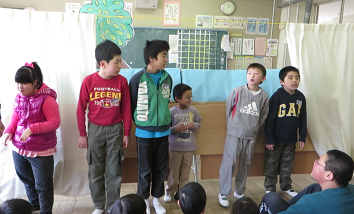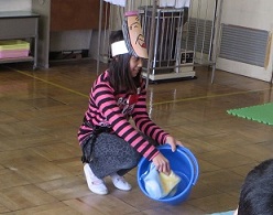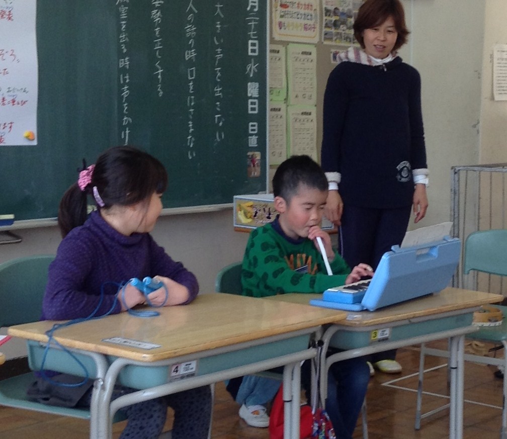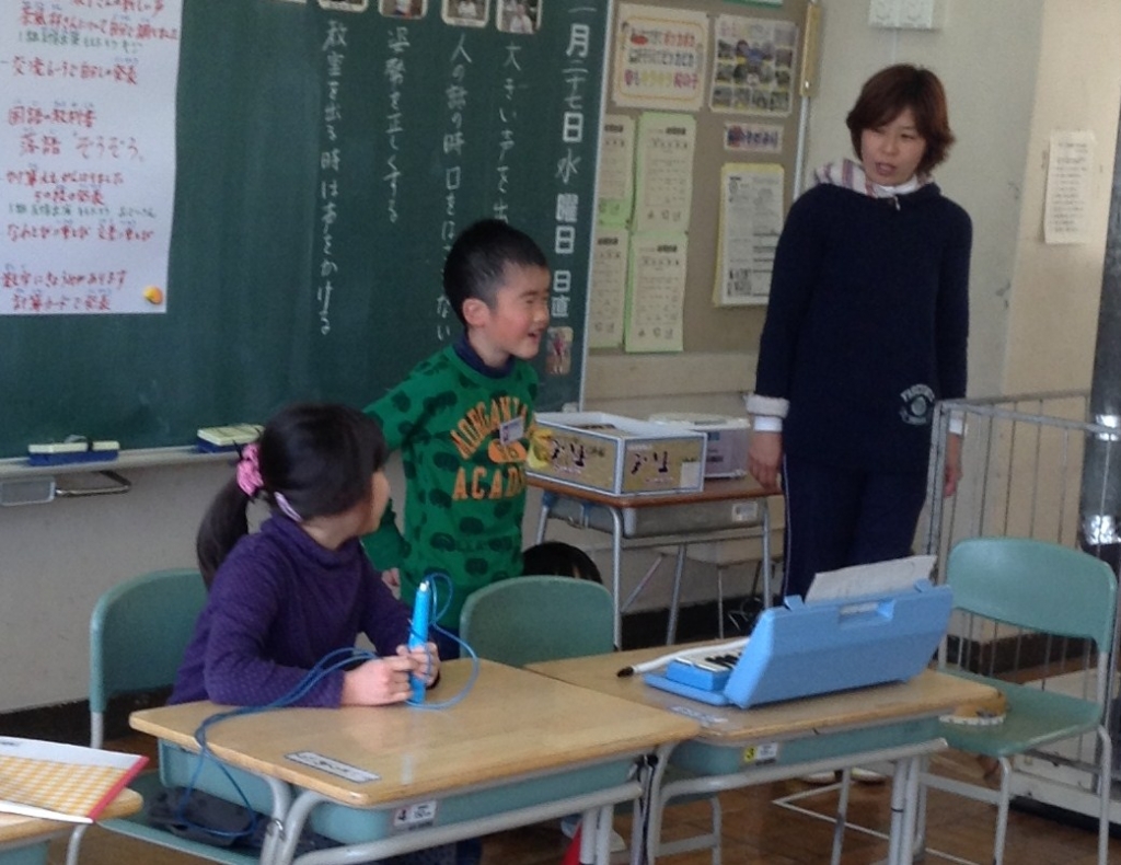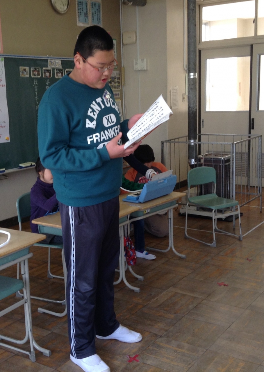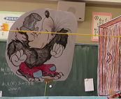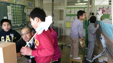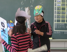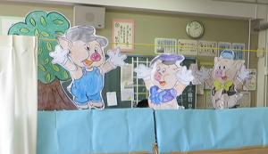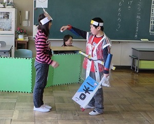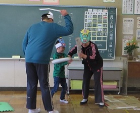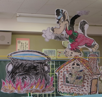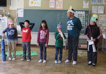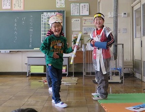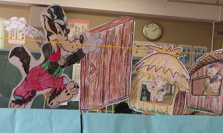 2月26日の授業参観では、大変お世話になりました。1組の教室では、劇「桃太郎」を見ていただきました。皆様のたくさんの声援や拍手を頂いて、子どもたちは、精一杯の演技をしたと思います。張りのある声で、のびのび大きな動きで、役になりきって楽しそうに演じていました。おばあさんは川で洗濯を。 「頑張るんだよ」と、きび団子を持たせます。 さるも桃太郎も観客に笑顔でアピール! 観客も大盛り上がり! 先生も鬼役をかって出てくれました。叩かれたり、やっつけられたりの熱演でした。 1組の劇の後、みんなで2組の教室へ移動。紙人形劇「3びきのこぶた」のセットがお出迎え。2組のみんなのあいさつは、「うまくできないところもあるけれど、みんなで力を合わせて頑張ります」と、しっかりできました。 ナレーションやセリフは、前もって何日もかけて少しずつ録音したものです。何度もやり直しをし、ようやく完成しました。セットはみんなで頑張っ作り上げたものでした。録音に合わせて人形を動かす練習も大変でしたが、何とか本番にこぎ着けました。 1番目の兄さんぶた、2番目の兄さんぶたは、簡単にわらに家、木の家を建て気楽に遊んでいます。末っ子の弟ぶたは一生懸命働いて頑丈なレンガの家を建てました。(セリフの朗読のじょうずさに引き込まれていきました。) 狼が登場。大きな人形の迫力とセリフの本気の力強さに「オオッ!」と声がもれました。「開けないと、こうしてやる!」オオカミは、大きく息を吸ってぇー、 「プーッ!」 このとき事故が起こりました。突然、音が消えたのです。セットの裏は大慌てでした。一体何が起きたのか、と。誰かがCDプレーヤーのコードに足をかけて引き抜いていたのでした。さらに、トイレに行ってしまったり、客席に戻ったり・・・。とにかくハプニングがまとめて起こりました。それでも、みんなは慌てることなく、この事態を楽しんでいるようでもありました。焦ったのは先生だけだったのかな? 何とか正常運転に戻してクライマックスへ。オオカミが煙突から進入しようとして、3びきのこぶたが仕掛けた大鍋に落ちる場面、オオカミの大きな「たすけてー」という叫び声が響いて、見事に完結することができました。 次は3組です。調べ学習の内容を紹介したり、落語を聞かせてくれたり、かけ算九九の暗唱をしたり、なわとび(二重とび、はやぶさ)の発表を行ったりしました。一人一人が精一杯のパフォーマンスを見せてくれました。 おわりのあいさつの時、司会者がぶっつけ本番いきなり強引に友達や保護者様に挨拶をお願いしてしまいましたが、見事にきちんと応じて感想発表をすることができました。その柔軟さと集中力と落ち着きに「おおっ!」という感嘆の声と拍手が起こりました。 みんなが「たくましくなったな」と感じた時間でした。