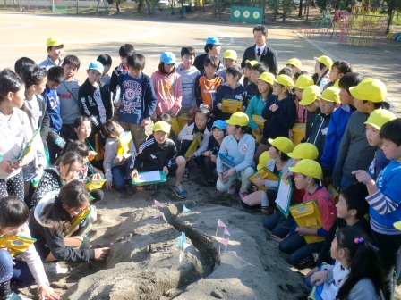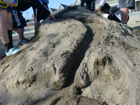 図書室から移動して、校庭の砂場へ。予想から結果へ。(ドキドキ・・・、ワクワク)