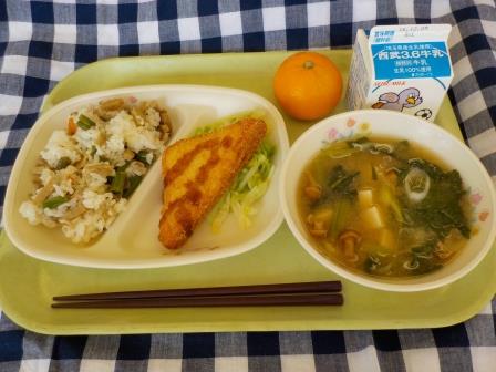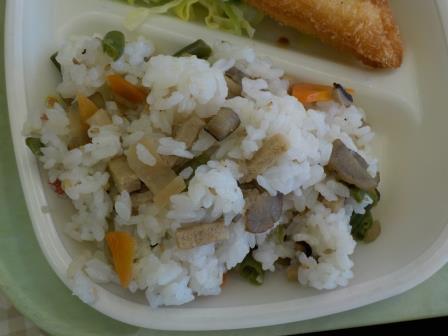 本日のかてめしは、にんじん、ごぼう、干ししいたけ、かんぴょう、さやいんげんが入っています。