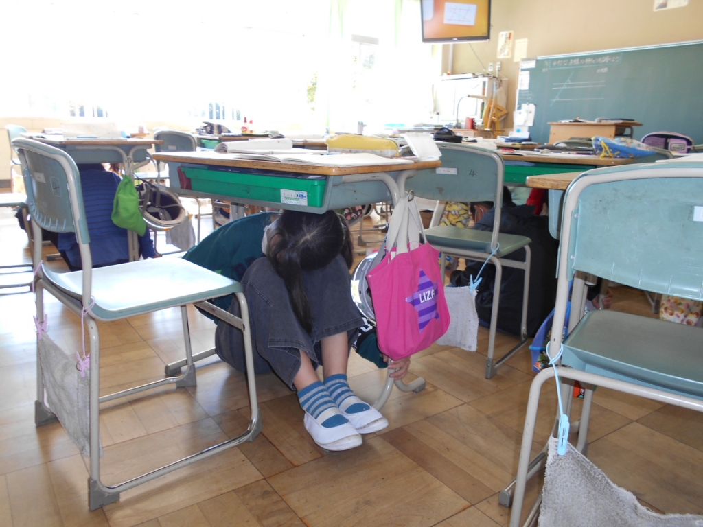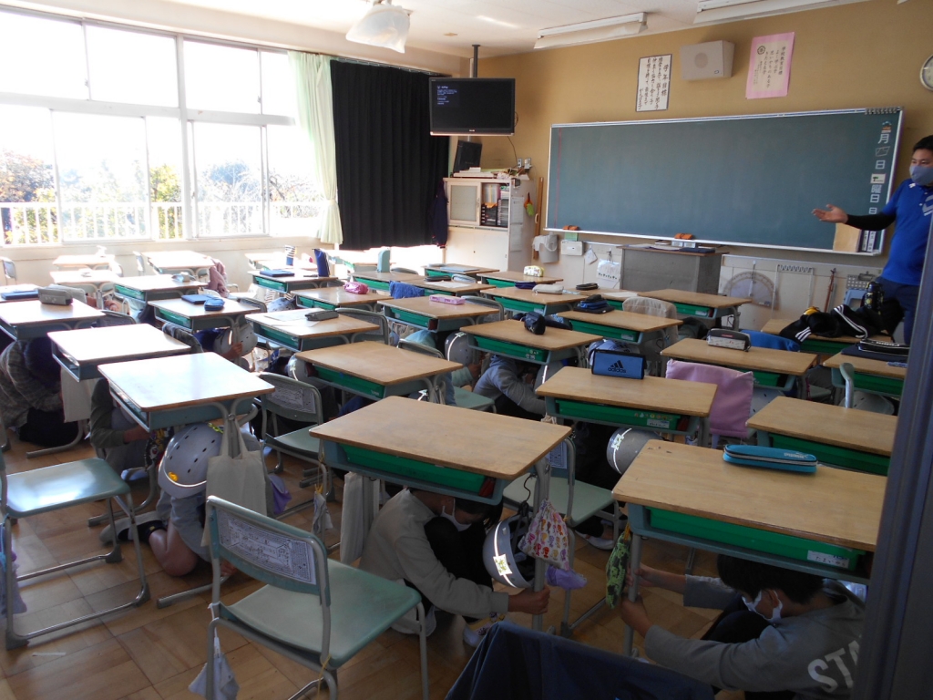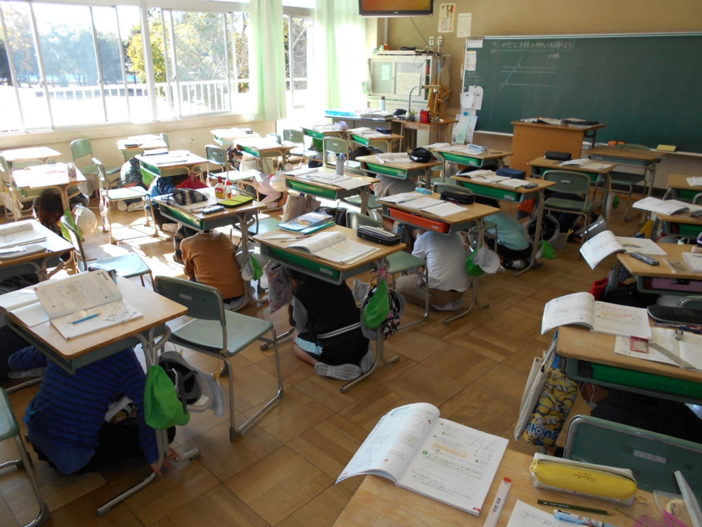 今日は、深谷市防災訓練に合わせて、全校でシェイクアウト訓練に参加しました。