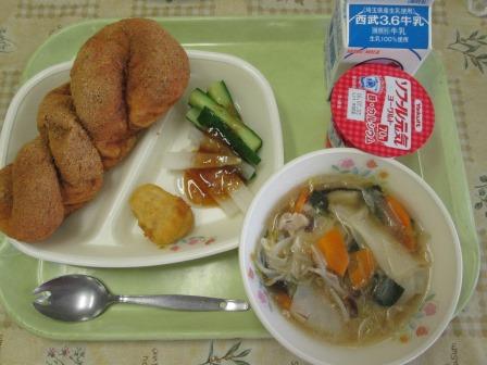 黒糖きなこ揚げパン、チキンナゲット、ワンタンスープ