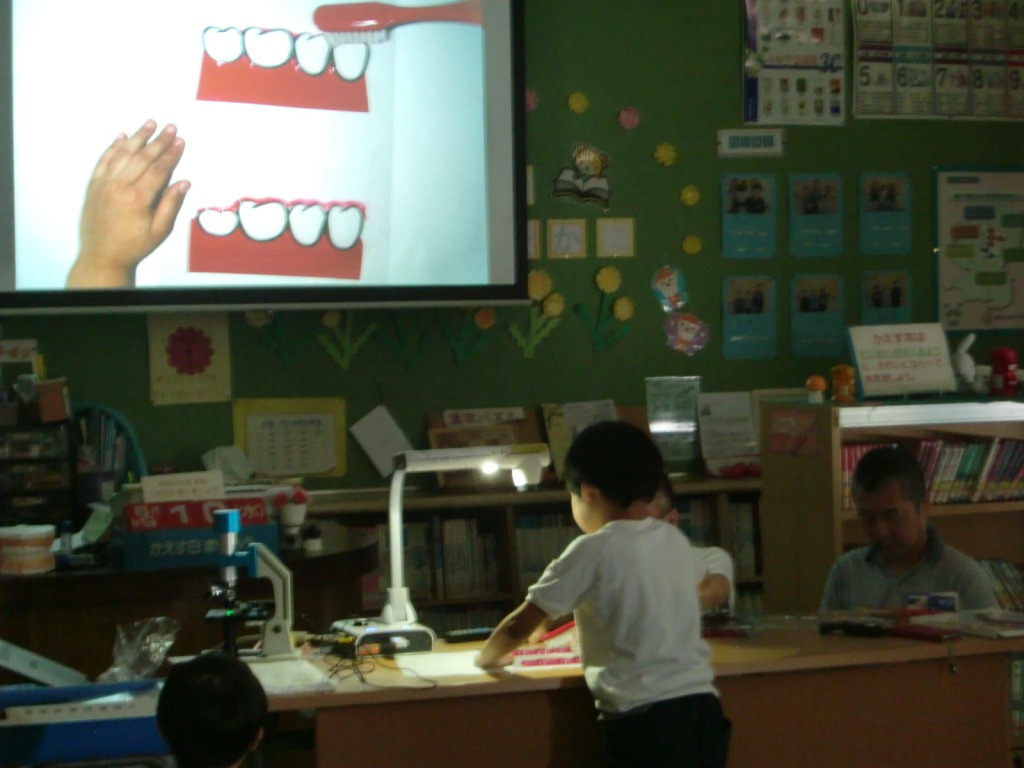 まず、図書室で歯の働きや、歯ブラシの使い方について教えていただきました。
