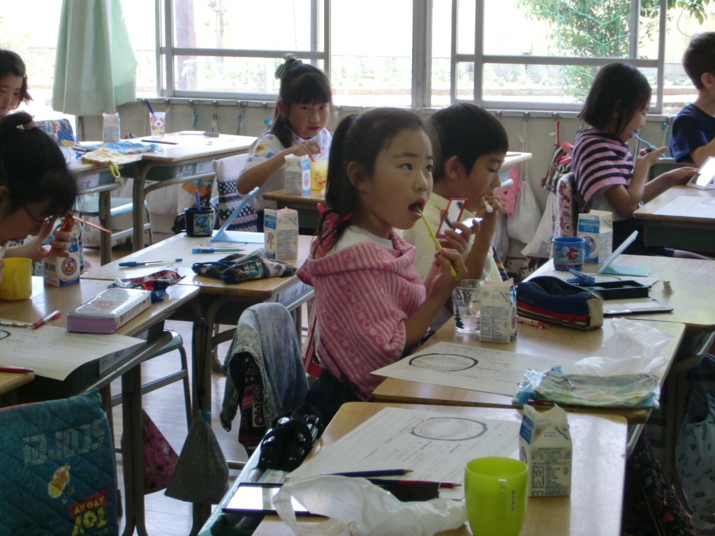 本日4日から11日まで、歯・口の健康週間です。3年生では学校医の中島先生、原口先生を招いて、歯のみがき方を指導していただきました。