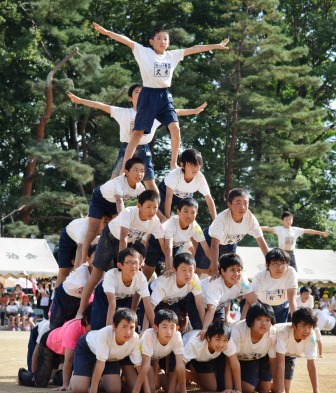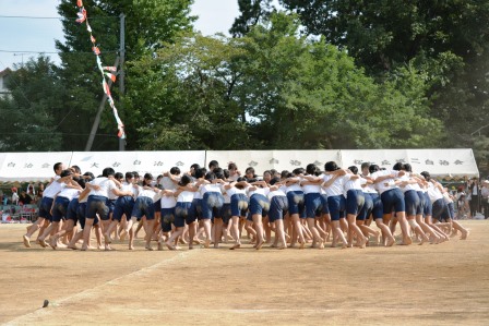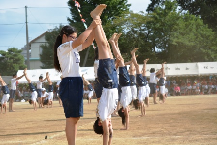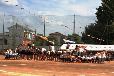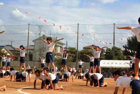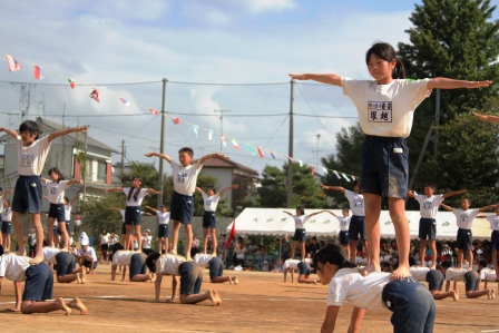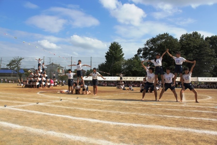 入場したら中央に集まり円陣を組んでエール!『組体操絶対成功させるぞ!』 一人技も美しくきまりました.
