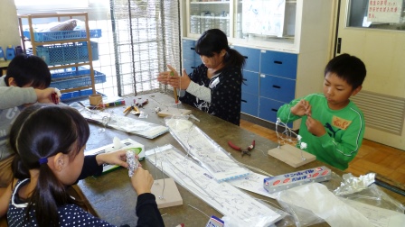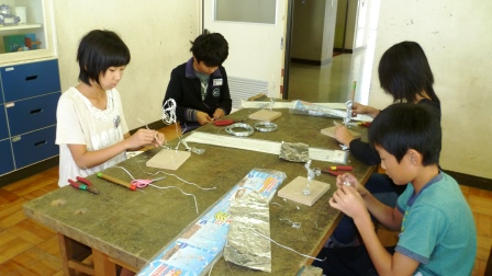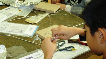 工作では今、かけがえのない一瞬を切り取って形に表す題材「そのときを形に」に取り組んでいます。針金やアルミの太い棒を使って思い思いの一瞬を表現しています。 アルミホイルを強調したいところに使ったり、空中に浮いているようにねじで留めたりと、自由な発想で楽しんでいます。