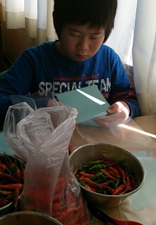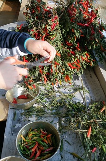 販売しなかった緑色やオレンジ色、小ぶりの唐辛子は、一つ一つ実から種を取り