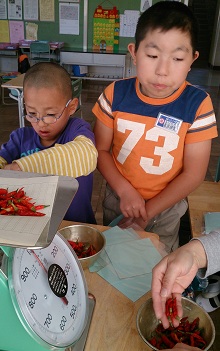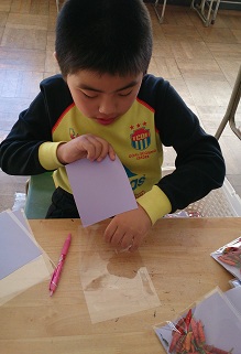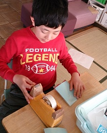 作業はみんなで手分けして行いました。計量器で量りとる人、ビニル袋に台紙を入れる人、