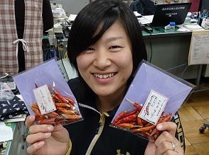 量り取ったトウガラシを袋に入れる人、テープで袋の口を閉じる人、