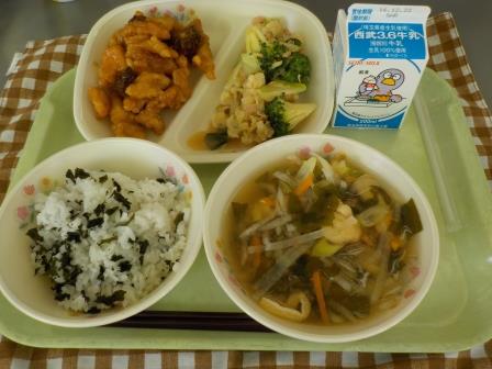 わかめごはん、とり肉とレバーのオレンジソース