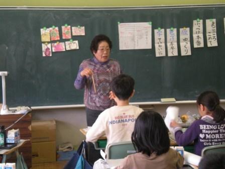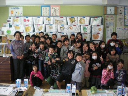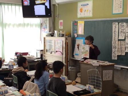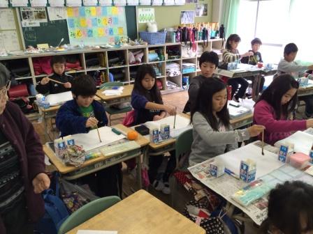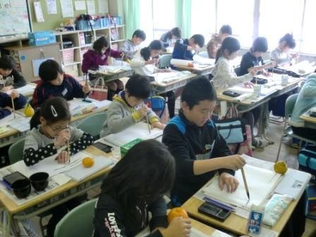 2月24日(月)、絵手紙教室をしました。3名の先生が各クラスで教えてくださいました。 初めての「絵手紙」に、ドキドキワクワクしながら挑戦しました。先生から、「線はゆっくり」「色つけは手早く」「字は丁寧に」と、絵手紙の基本を教えていただき筆をとりました。 持ち寄った画材を真剣に見つめながら、心を込めて描き進めていきました。言葉は、家族への感謝の思いをしたためました。仕上がった絵手紙を前に、みんな満足した笑顔で「はい、ポーズ」。3名の先生方、ご指導ありがとうございました。この日仕上げた絵手紙は、26日の「2分の1成人式」の式場に掲示し、保護者の皆さんにみていただきました。