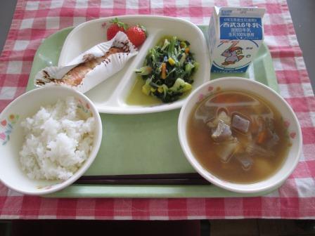 ほうれん草のカレー風味いため、けんちん汁、いちご、牛乳