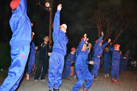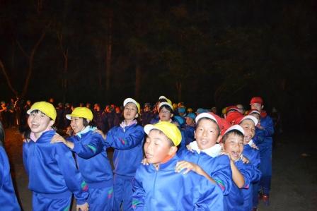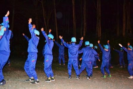 厳かな火を囲んで真っ暗な中、厳粛な【点火のつどい】が、進められていきました。火の子は、たいまつを掲げ厳かに、火の神から「勇気と希望の火」「友情の火」「努力の火」を分けてもらいました。火の子役の児童たちはそれらの火をみごとに受け取ることができました。神々しい火を見つめながら、子どもたちは生きていくために大切なことを改めて考え