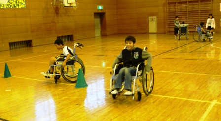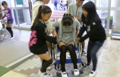 6年生全クラス、高齢者疑似体験と同様に車椅子体験もしました。社会福祉協議会からお借りした車椅子10台と、本校にある車椅子を3台使い、一人一人が車椅子を操作してみました。通路に出てゆるいスロープを、1人で操作したり、段差にきたら自分で助けを呼び、お願いしてあげてもらったりという動作を順番にやりました。意外に難しかったり、怖かったりした子ども達は、