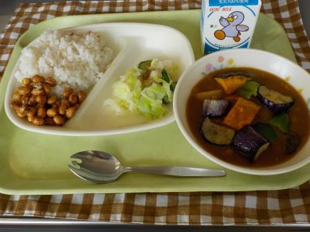 夏野菜カレーライス、大豆とじゃこのかりかり揚げ