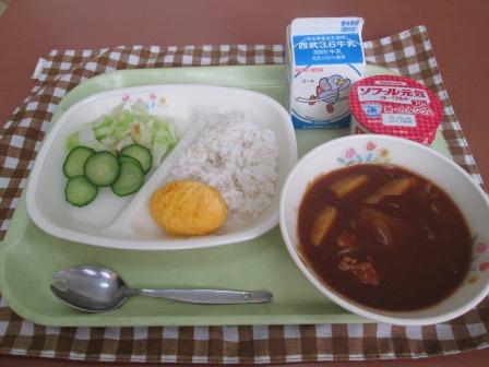 ハヤシライス、オムレツ、きゅうりとキャベツかんきつドレッシング