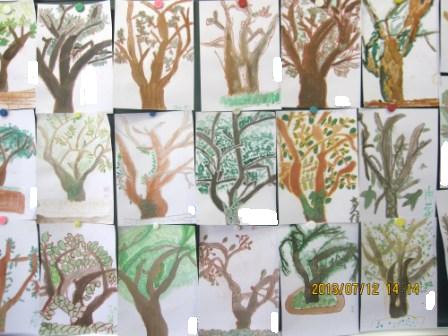 同じ桜の木を描いたのに、一人一人の見つめ方、感じ方の違いがわかる作品ができました。この学習を生かして、大きな画用紙に自分のお気に入りの「木」を描いていきます。
