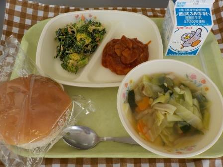 冬野菜のごまマヨネーズあえ、野菜コンソメスープ、牛乳