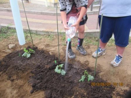ヘチマが大きくなってきたので、棚の下に植え替えました。