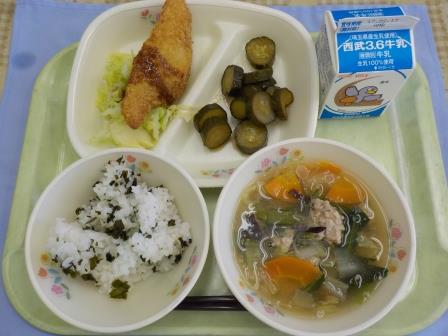 肉団子と白菜のスープ、きゅうりのぴりっと漬け、牛乳