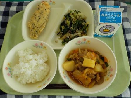 笹蒲鉾の石垣あげ、磯の香りあえ、牛乳