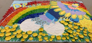 ステージには、5年生全員で作った壁画が会を盛り上げました。タンポポ畑に虹がかかり、6年生が巣立つイメージです。