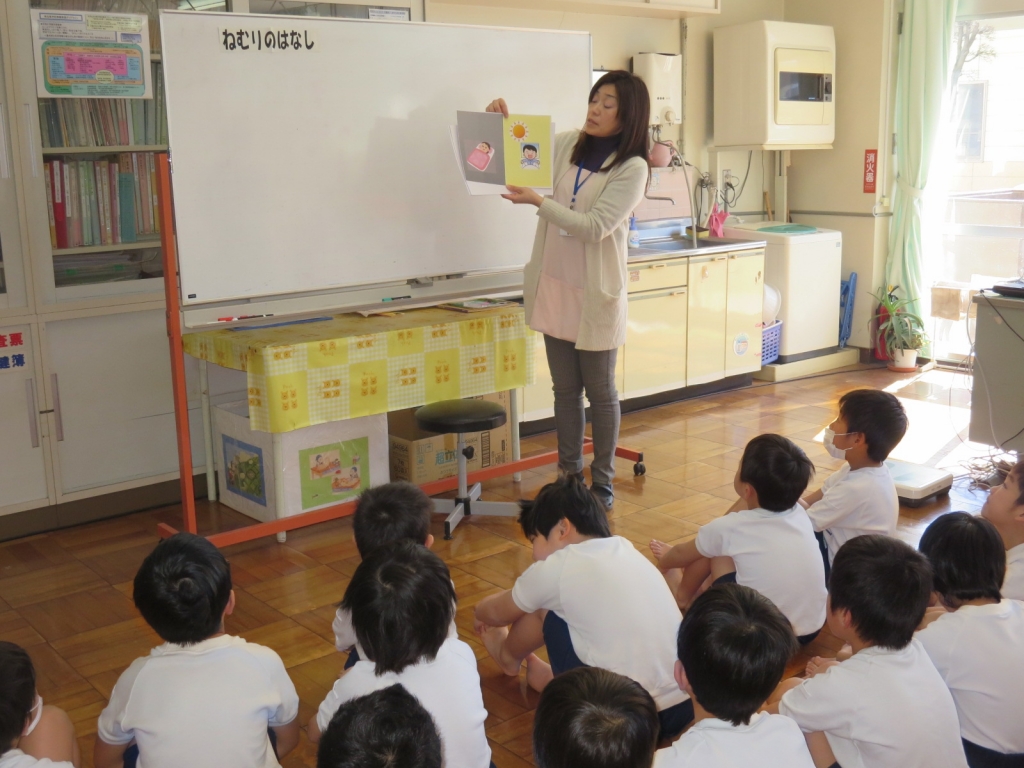 一年生は、養護教諭から、睡眠の大切さやゲームなどのブルーライトの害に