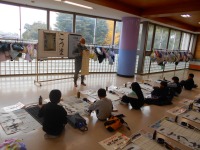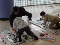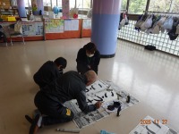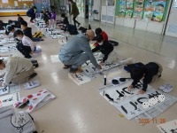 大きな下敷きと長い紙、太い筆の扱い方に戸惑う児童もいました。