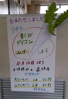 「お待たせしました。今年も青くびダイコンを販売します。一本50円だよ。