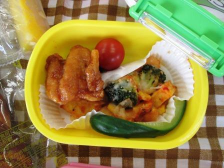 とり肉のレモンに、手作りピザポテト、きゅうり、冷凍パイン