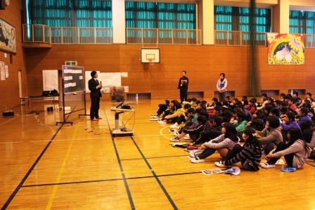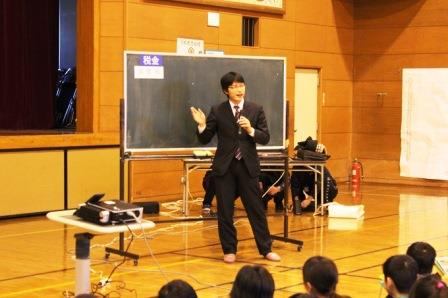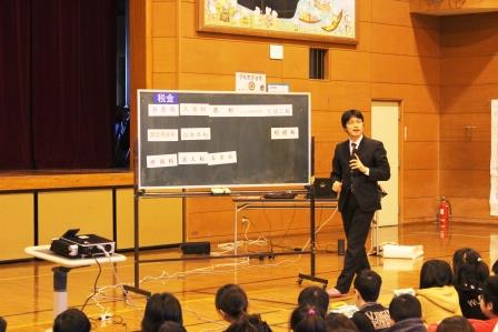8日に6年生は税理士会から福島さんをお招きし体育館で租税教室を開きました。税は生活の中で身近なものですが、小学生にはなかなか難しいものです。歴史の学習を終え、政治の学習に入るこの時期の6年生に、税の理解を深めることを目的として開いた教室でした。
