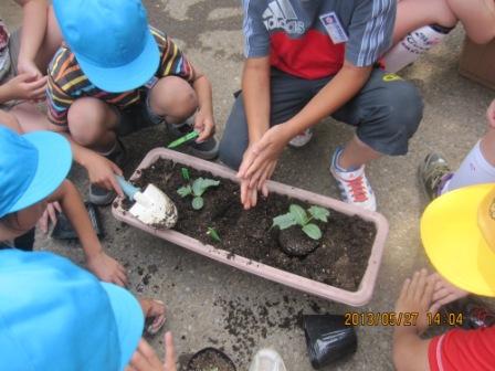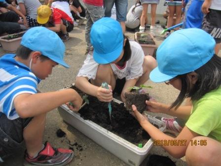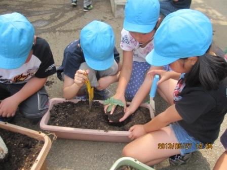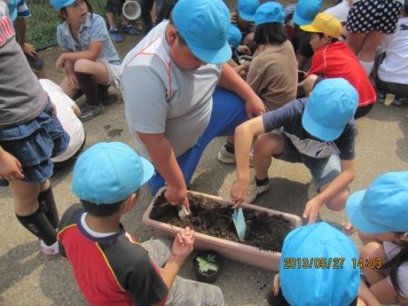 ・プランターの土に大きめに穴を開けます。   ・ポットから苗を取り出します。