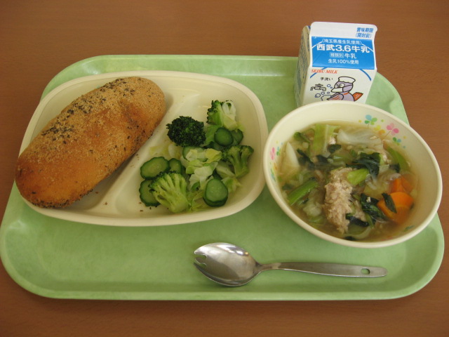 黒ごまきなこ揚げパン・キャベツと肉団子のスープ