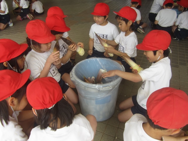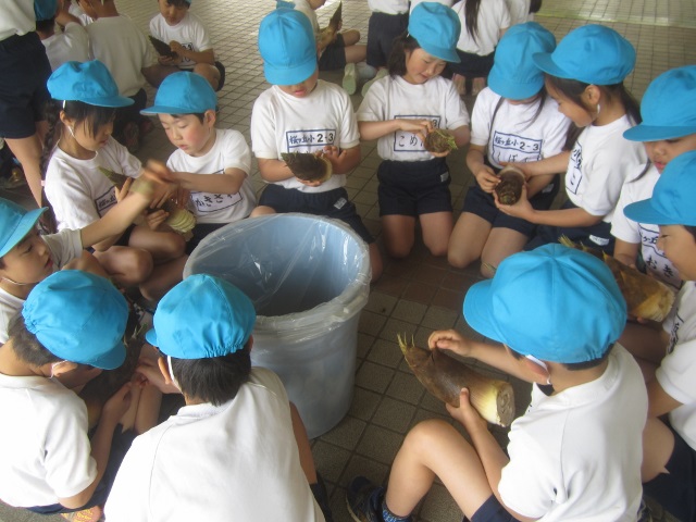 給食室との連携で、2年生がタケノコの皮むきを体験しました。皮をむきながら、「春のにおいがするね」と、嬉しそうでした