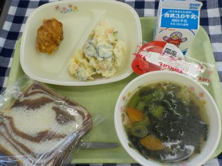 わかめスープ、ポテトサラダ、いちごぜりー、牛乳